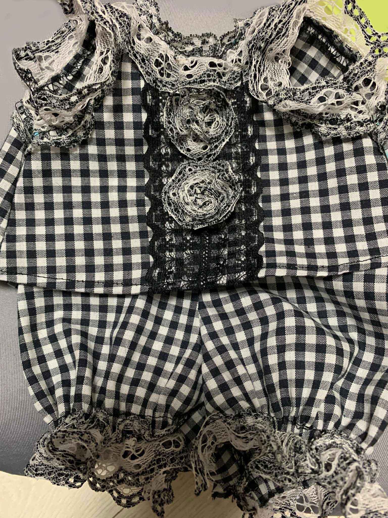 お洋服は白黒のギンガムチェック柄のブラウスとパンツのセット。